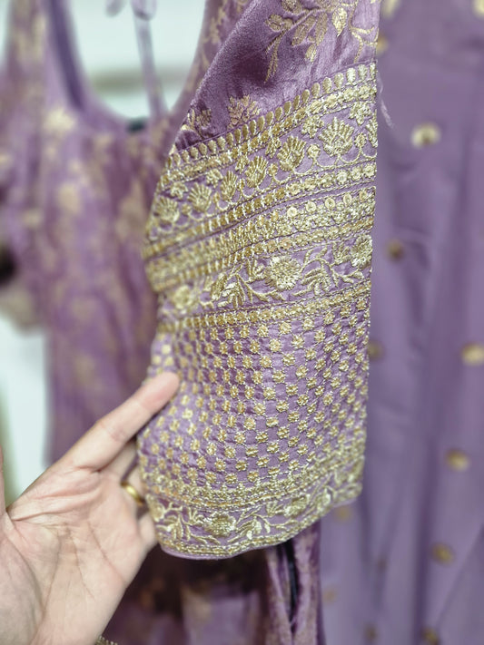 Soft Lilak Brocade Suit Set – With Dupatta & Plazo| Elegant Festive Wear