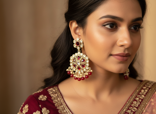 Stunning Traditional Kundan Earrings with Pearl and Red Bead Accents